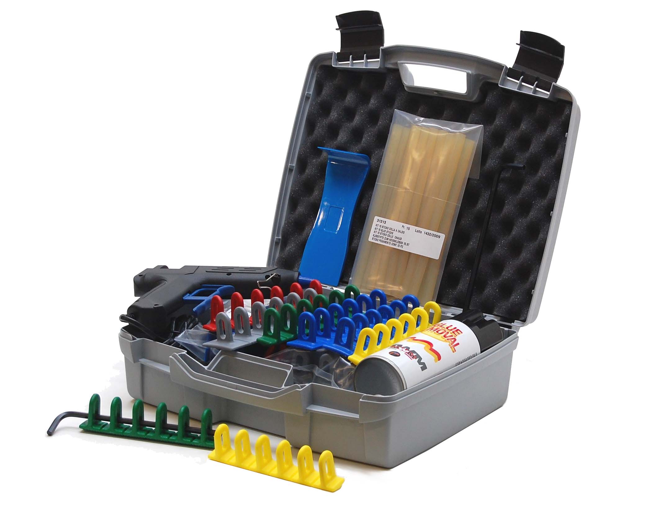 contenente una pistola per colla a caldo 80w 110-230v + 10 stick colla a caldo+ 5 set da 3 pezzi dei multipads rossi grigi verdi blu e gialli+ spray rimuovi colla a caldo, spatola raschia colla e perno per rondelle asolate